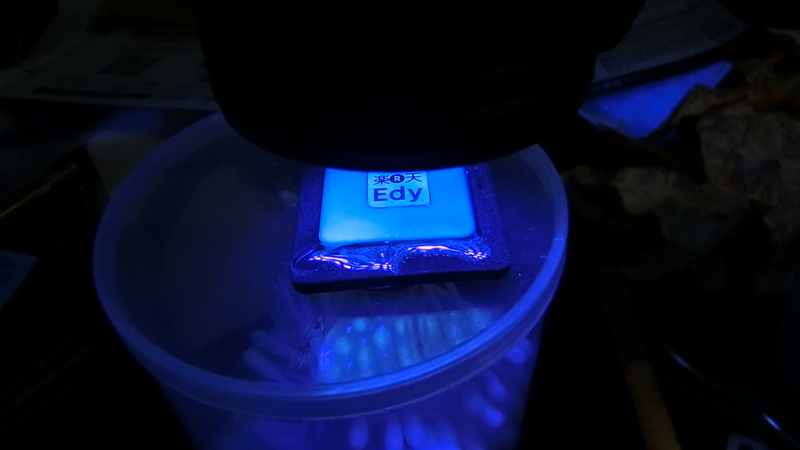 レジンのいいとこはノリや接着剤と違い、粘着しない。のであふれたレジンをすくい取り上にかけて体裁を整える。爪楊枝などで気泡を取り除いて準備完了。